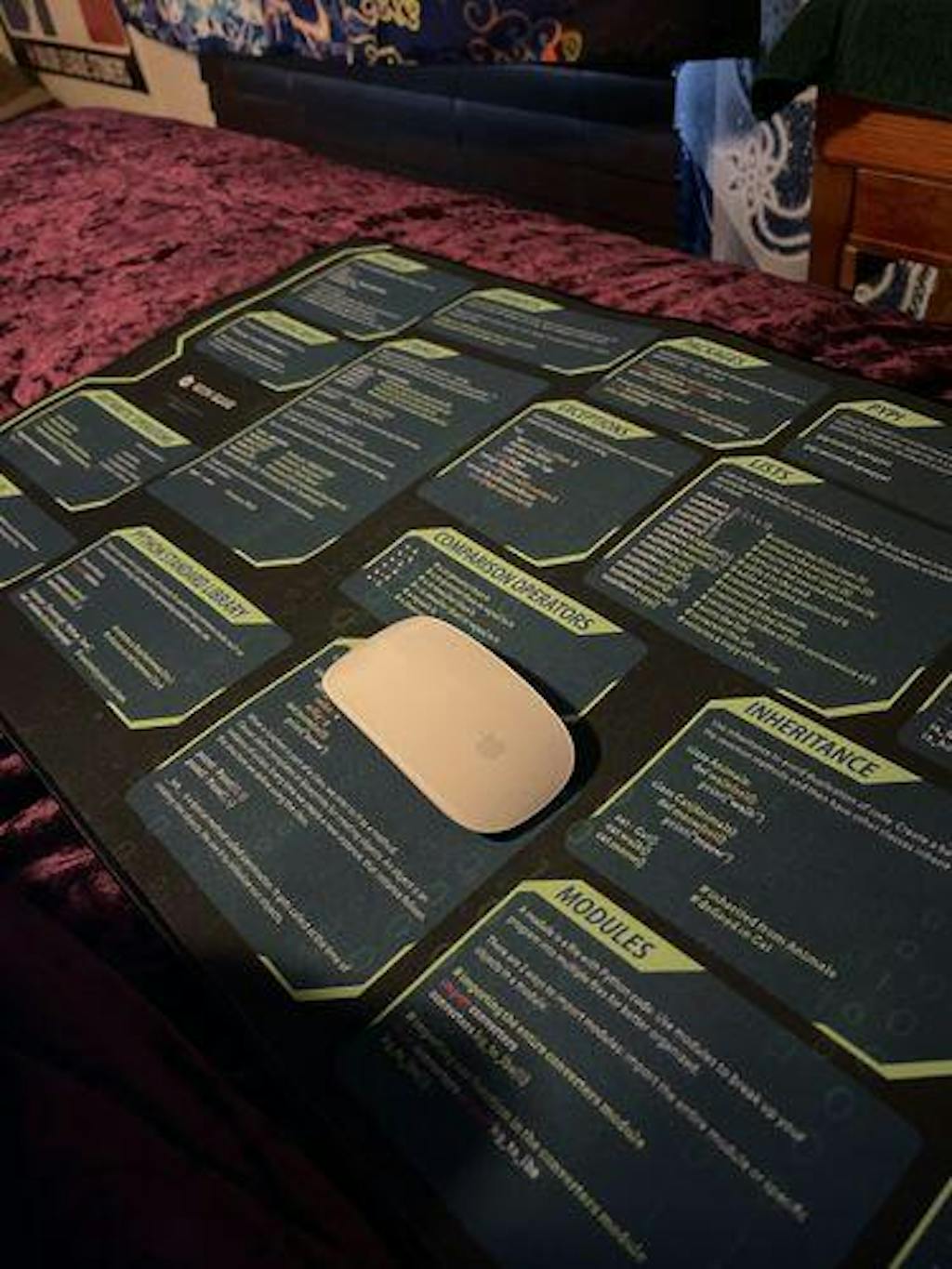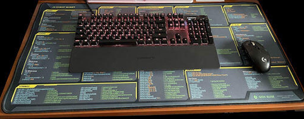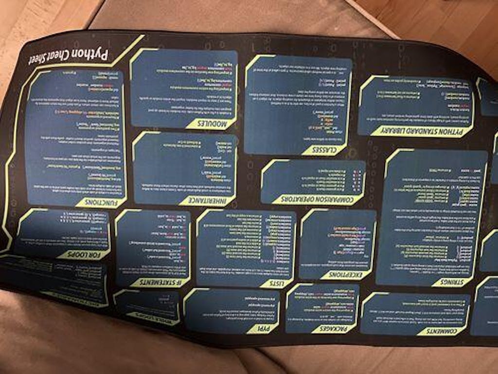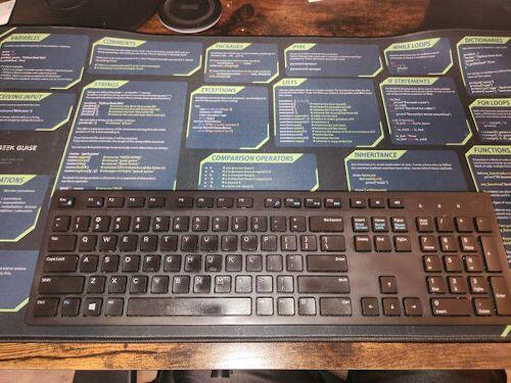My review of the python desk mat. This mat is an excellent addition to your desk, if you are a developer. I've been looking for something like this for ages and I finally saw this on facebook 2 weeks ago. It's smooth and works well with my mouse. I find it helpful when I am doing back end development. The mat feels like good quality and I don't think it will have any significant wear and tear in a couple of year. I spilled a bit of coffee on due to the smooth surface it can easily be wiped off. The text is easy to read. I added a controller for size. 5 stars.